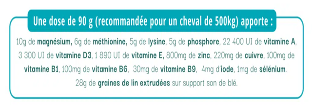 Les apports du CMV Harmonie Vital sont calculés de façon à couvrir les besoins du cheval quand le fourrage ne suffit pas. On sait notamment, grâce à l’analyse de nombreux fourrages (herbe/foin), qu’aucun ne contient assez de cuivre et de zinc pour couvrir les besoins optimaux d’un cheval, même en maintenance.
