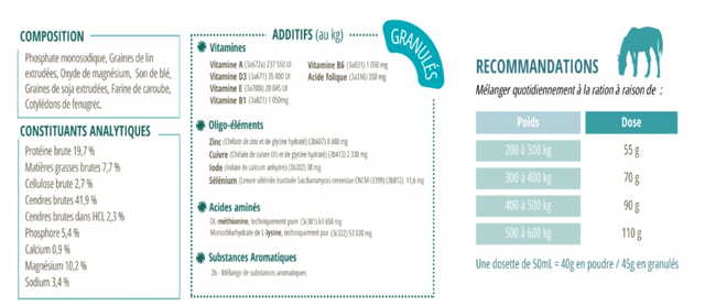 Les apports en minéraux, oligo-éléments et vitamines sont les mêmes que dans les versions standard. Seule une partie du lin extrudé a été remplacée par du soja français et non OGM.
