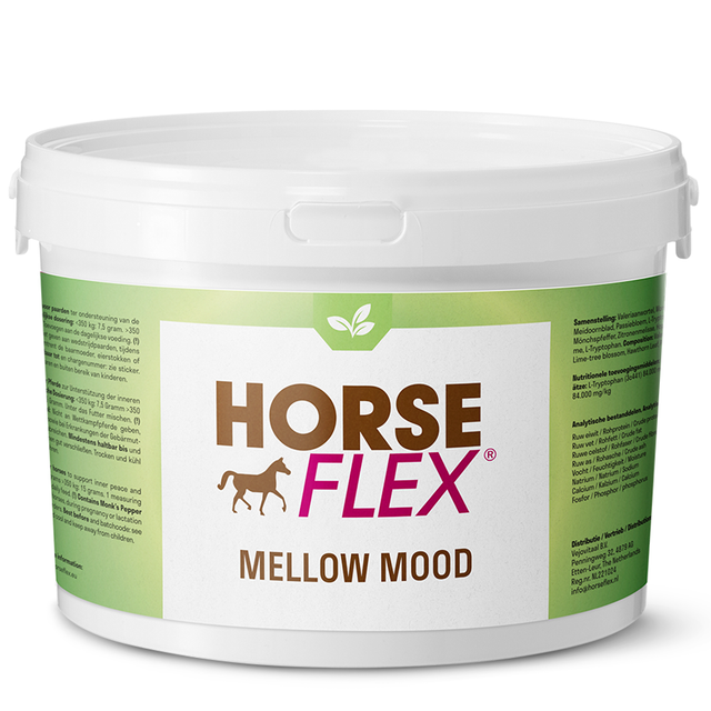 HorseFlex Mellow Mood est un complément naturel qui favorise l’équilibre hormonal et apaise la nervosité. Idéal pour les chevaux irritables, sensibles ou sujets au stress. Sa formule associe gattilier, valériane, passiflore et L-tryptophane pour soutenir la détente et la stabilité émotionnelle, sans provoquer de léthargie.